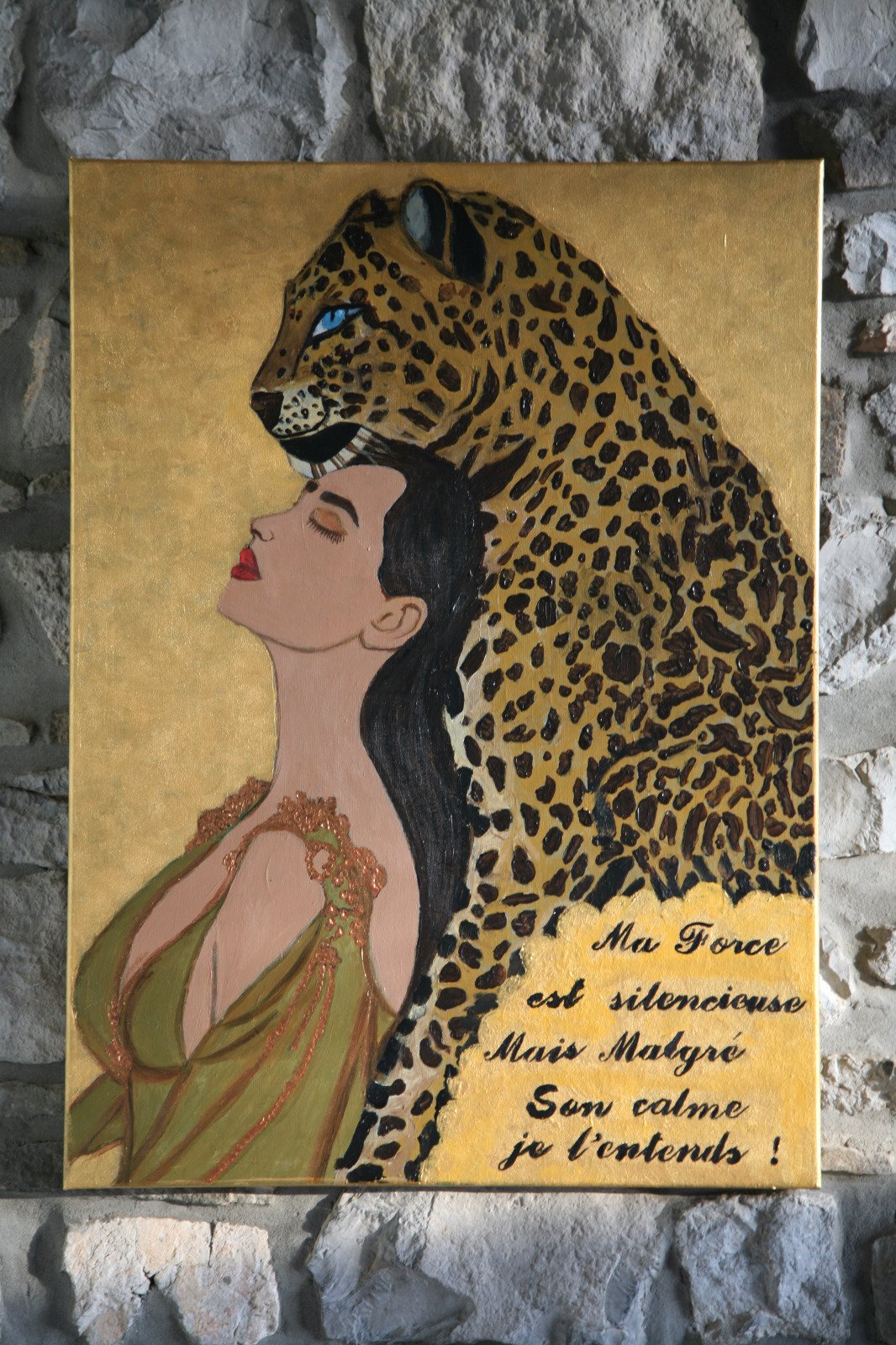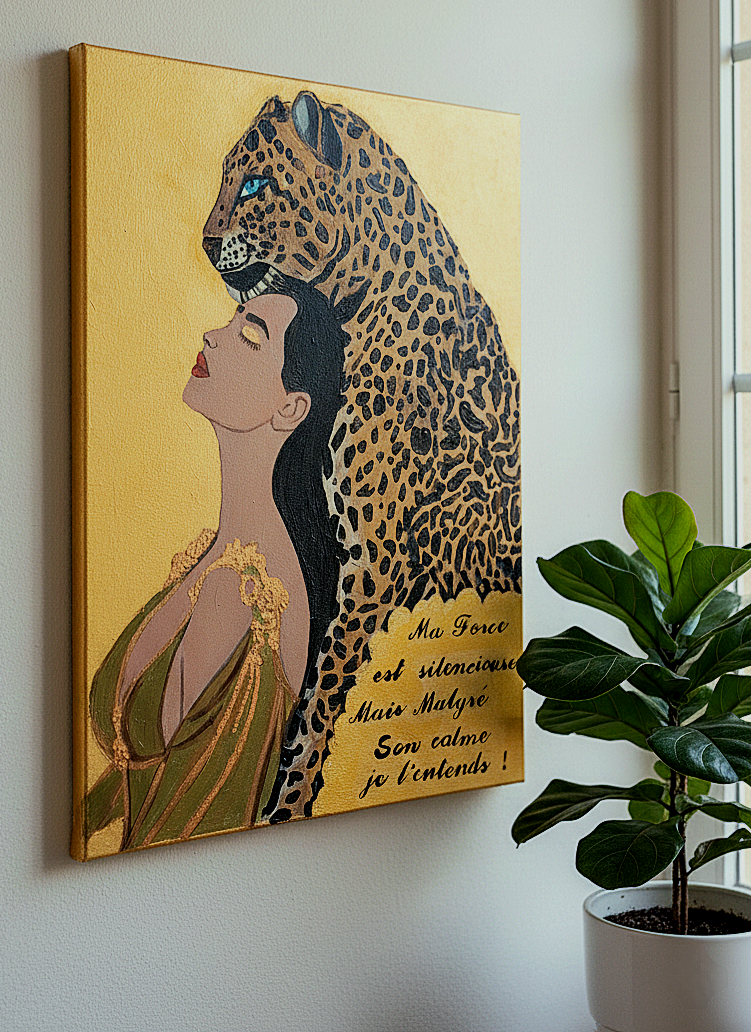 "Cette peinture capture le dialogue invisible entre la sérénité extérieure et la force infinie qui réside en nous. Ici, la femme ne craint pas la sauvagerie du léopard ; elle l'embrasse comme une partie intégrante de son âme. C'est un message dédié à chaque femme : la véritable puissance ne réside pas dans le cri, mais dans cette voix intérieure calme qui apporte stabilité et courage. Peinte avec amour, cette œuvre nous rappelle que la beauté et la résilience sont les deux faces d'une même pièce. Détails techniques : Dimensions : 70 × 50 cm Technique : Peinture originale ( Peinte avec amour ) Citation incluse : " Ma Force est silencieuse , Mais Malgré Son calme, je l'entends !" Prix : 660 €"