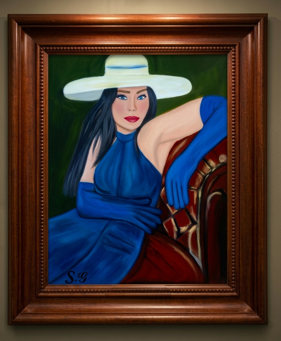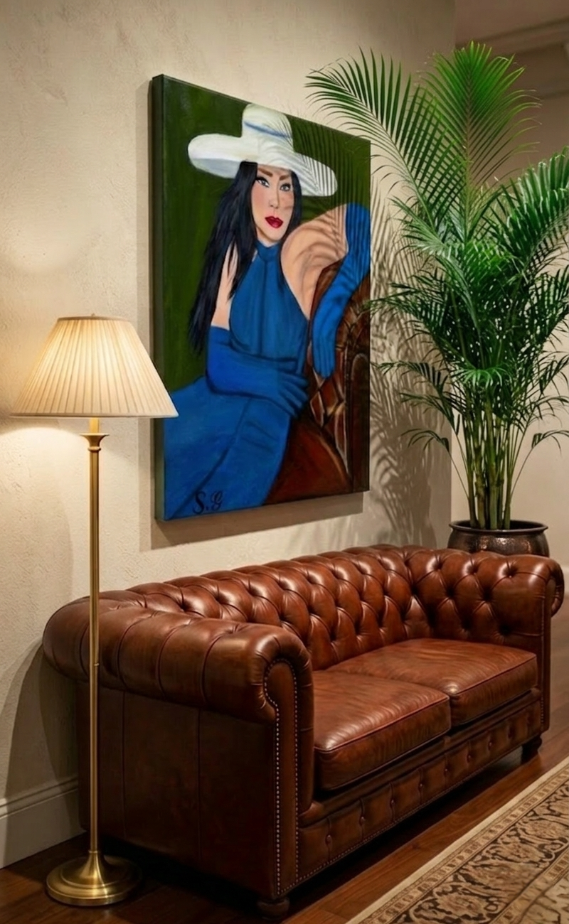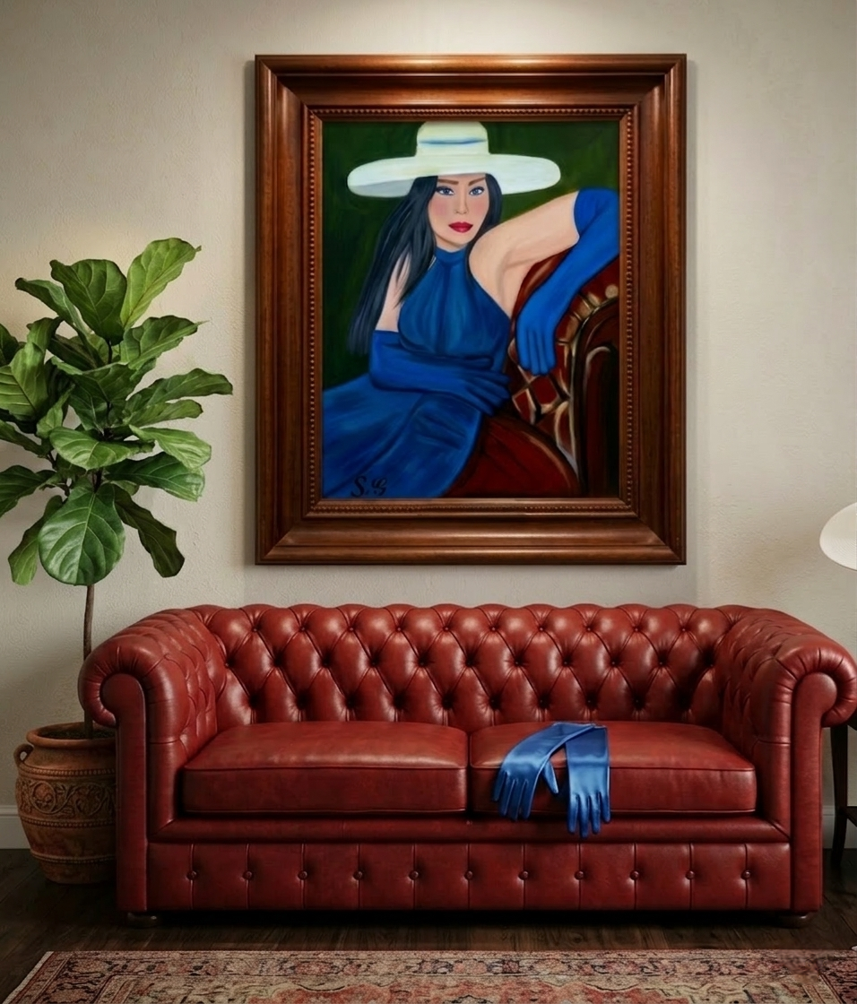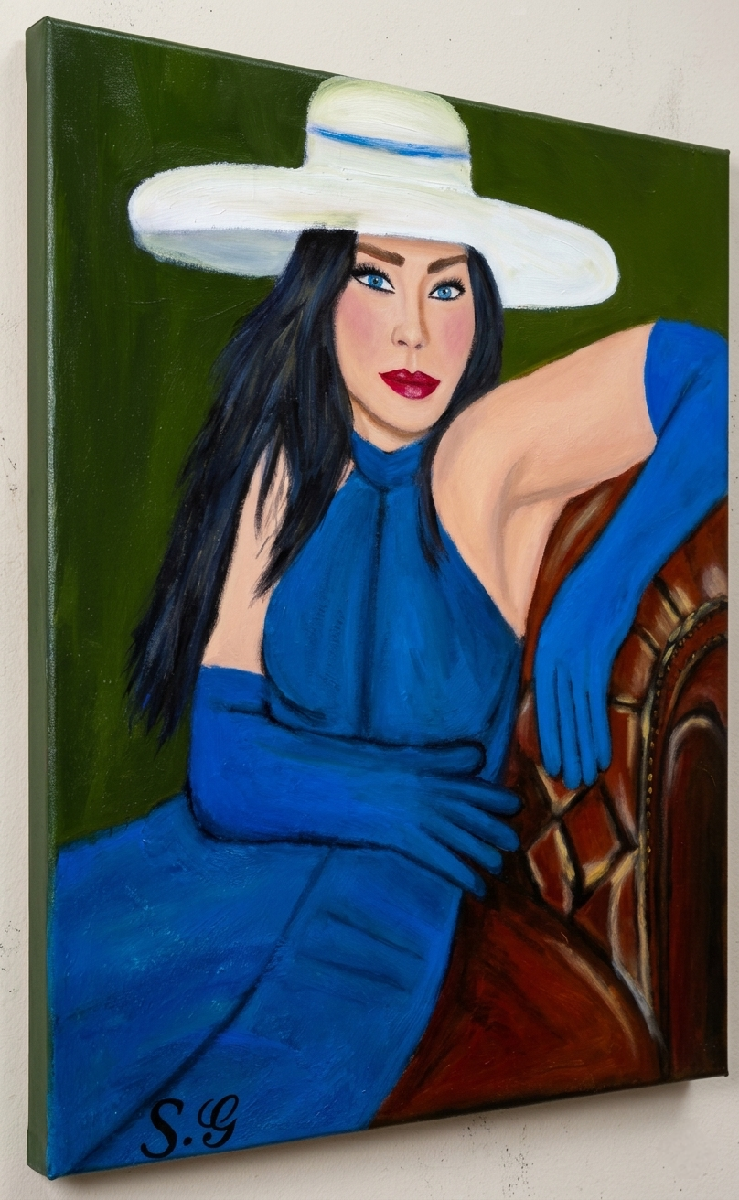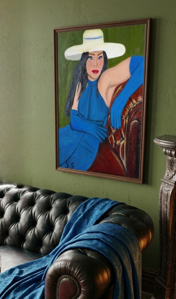"Plongez dans l'univers de l'élégance intemporelle avec cette œuvre magistrale intitulée 'La Belle Haifa en Bleu Royal Cette peinture à l'acrylique capture une présence féminine à la fois audacieuse et raffinée, où le bleu royal profond des gants et de la robe dialogue harmonieusement avec la pureté d'un large chapeau blanc. Réalisée avec les pigments de haute qualité Amsterdam Acrylics, l'œuvre se distingue par des contrastes vibrants et une texture riche qui apporte une profondeur unique au regard de 'Haifa'. Sur un châssis de 78x58 cm, cette pièce unique s'affirme comme un hommage à la sophistication moderne et à la grâce classique. Une signature artistique qui saura sublimer les intérieurs les plus prestigieux d'Europe Technique : Acrylique sur toile (Amsterdam Acrylics). Dimensions : 78 x 58 cm. Authenticité : Œuvre originale"