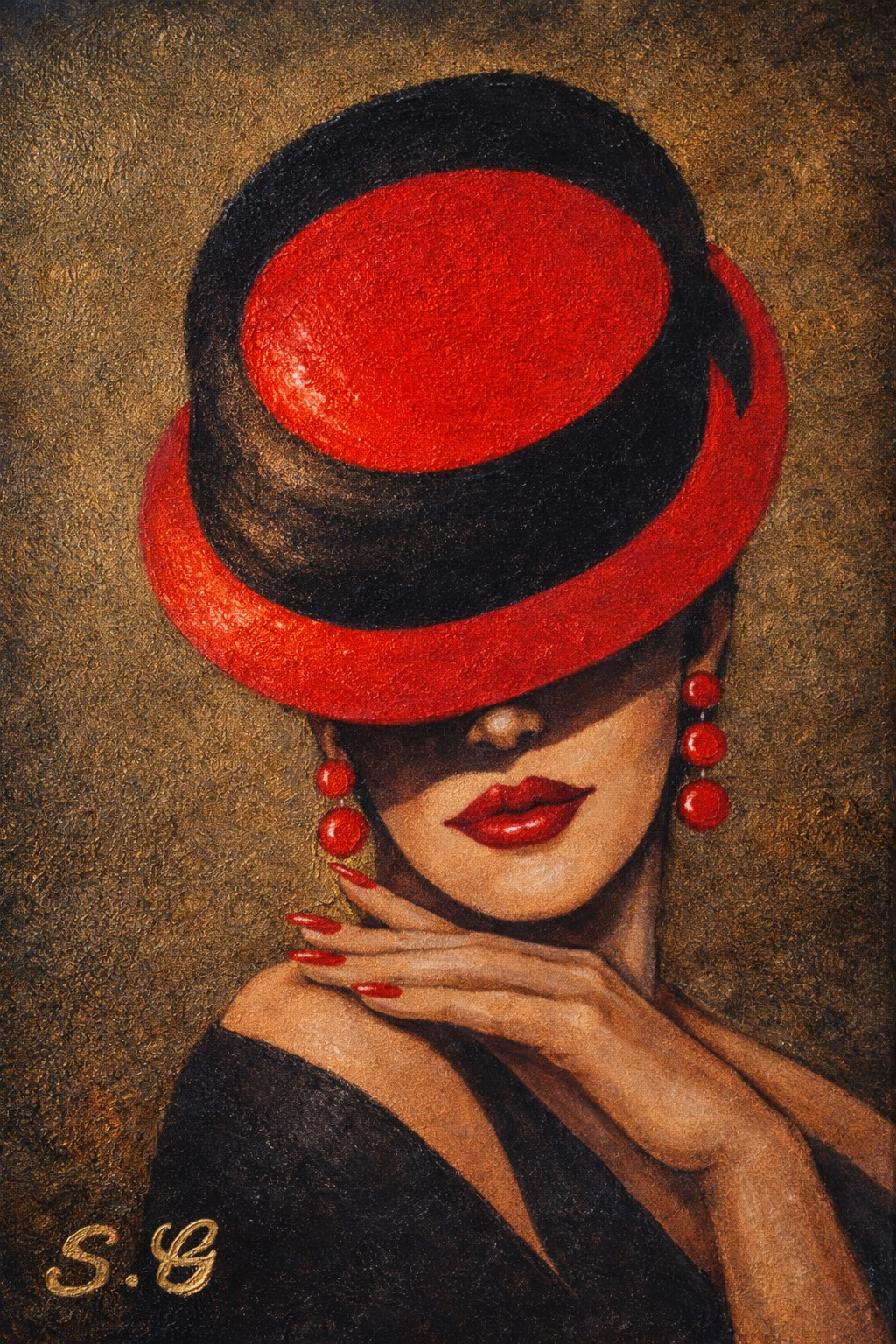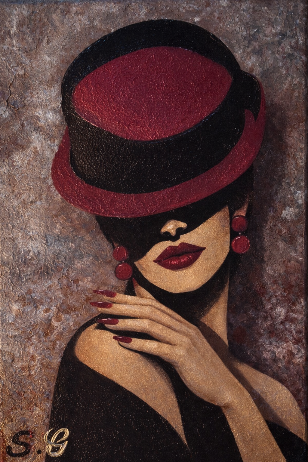 "Une œuvre qui capture l'essence de l'élégance intemporelle. Entre ombre et lumière, Regard Voilé joue sur le mystère d'une présence féminine dont le regard se dérobe pour mieux fasciner. Le contraste saisissant entre le rouge passion, le noir profond et les reflets dorés crée une atmosphère de sophistication pure. Une pièce maîtresse pour un intérieur moderne qui cherche à allier force de caractère et douceur mystérieuse Technique : Acrylique sur toile Format : 40x50 cm Pris : 460€"